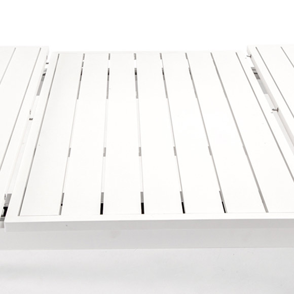Tavolo Lipari firmato Grattoni allungabile con struttura in alluminio verniciato con piano in doghe di alluminio saldato.